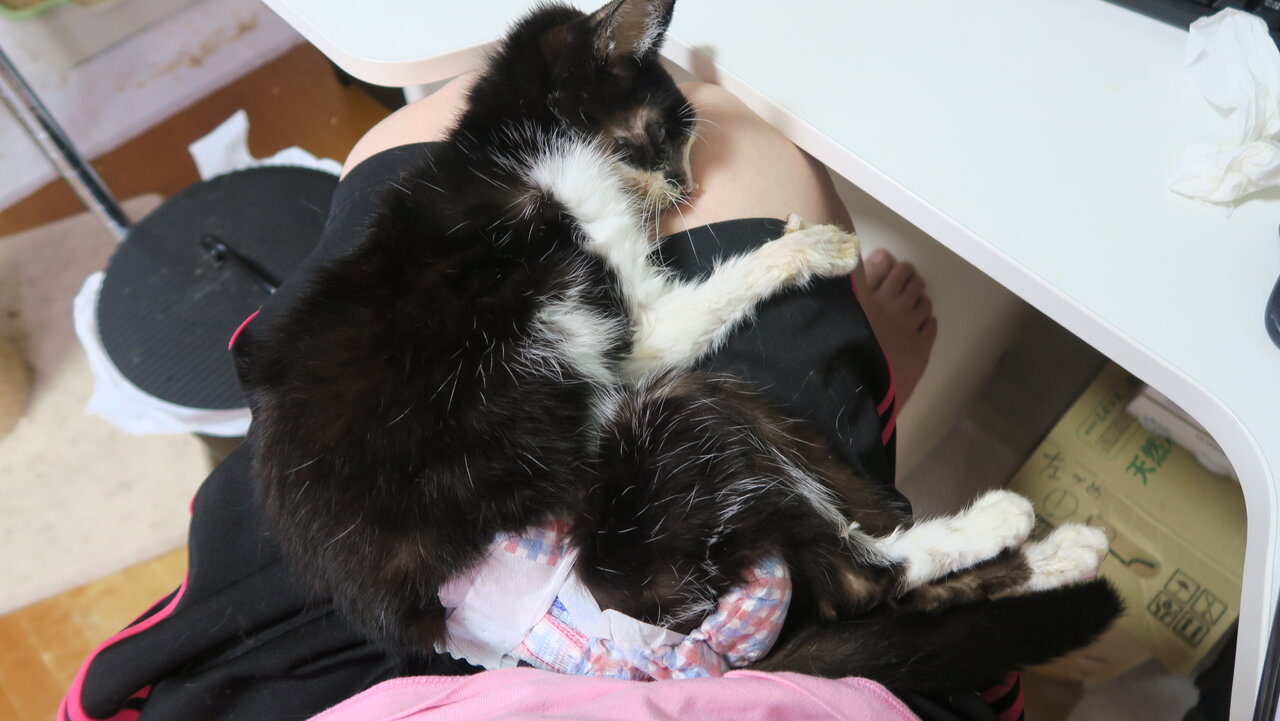 いつもなら、だいぶ動きが散漫になって段差がこえられなくなったとはいえ真っ先にはなの膝からおりてダッシュで逃げていく。